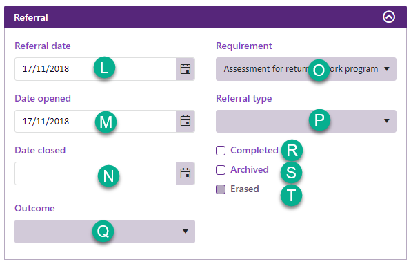 - The Referral type is additional information related to the Requirement. It is often used to record who generated the referral, such as an Insurer, Doctor or Employer.