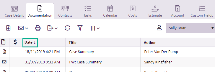In the example above the list of documents is sorted by their Date field. The triangle points downward indicating that the sort is in descending order, i.e. with the highest (most recent, in this example) at the top of the list.
