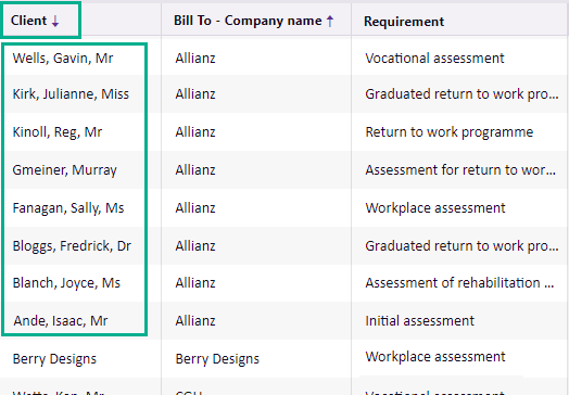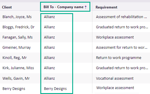 After we shift-click the Client heading twice the list remains sorted by Bill To company, but within this it is sorted by Client in descending order.