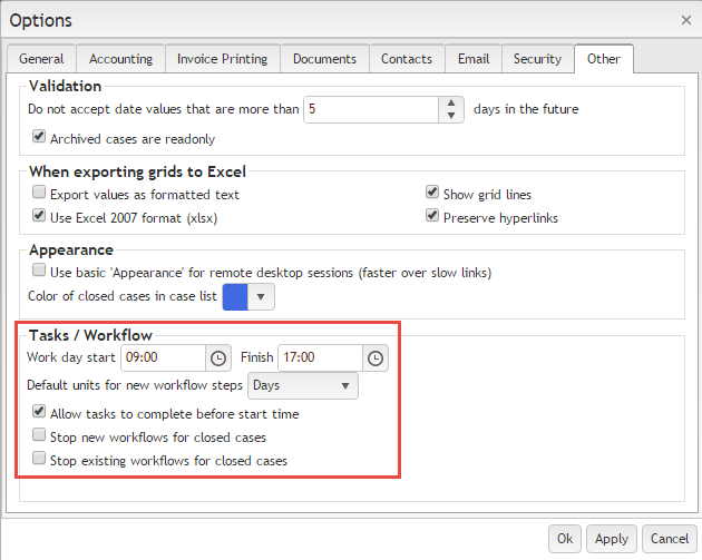 | Stop existing workflows for closed cases | Specify whether you want to stop existing workflows (i.e those already triggered) from continuing to function after a case is closed. This setting also specifies that recurrent tasks completed in a closed case do not continue to recur. Thus, when you complete a recurrent task in a closed case no new task will be created. |